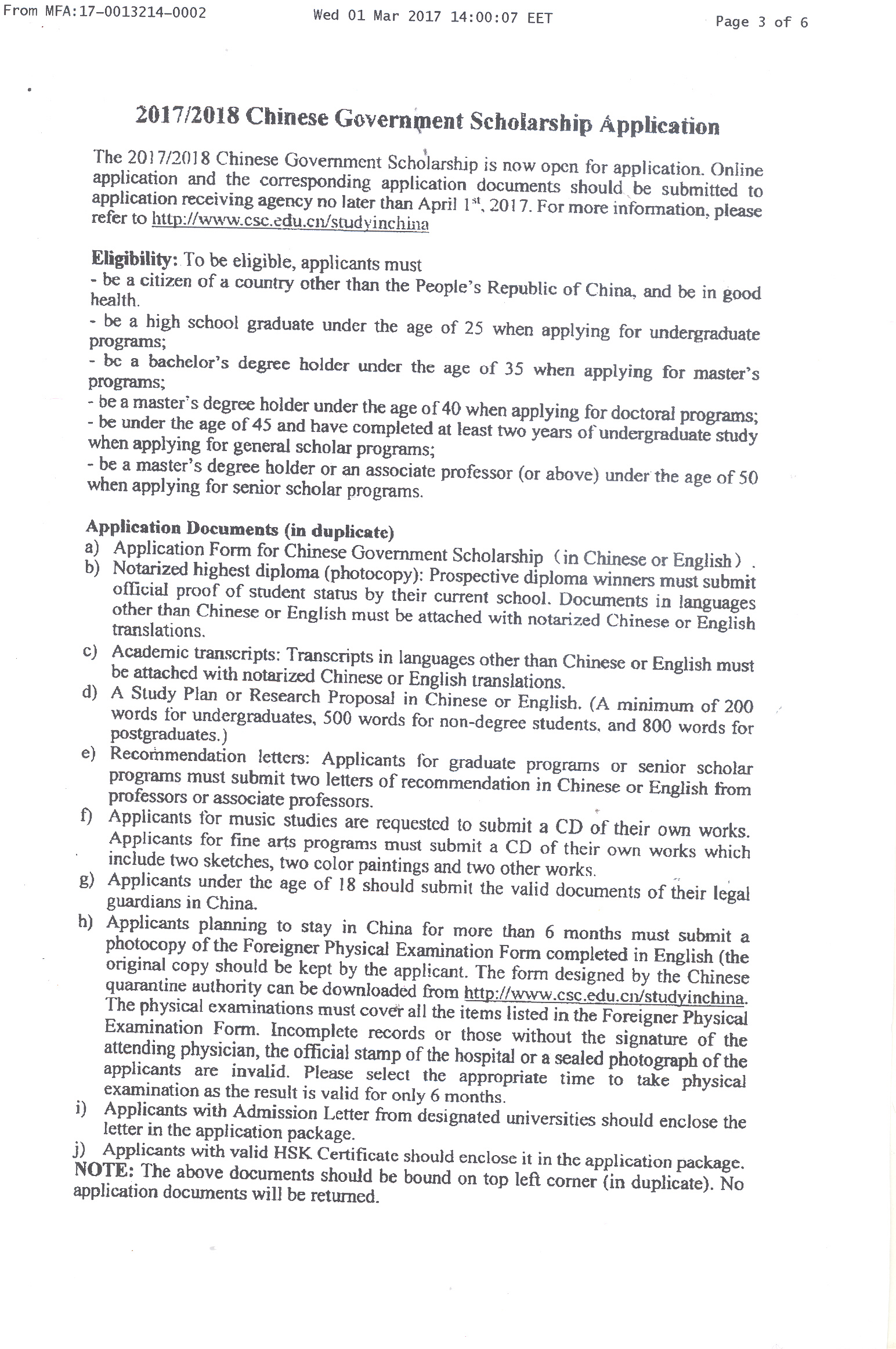 Αναρτήθηκε από secretary. Δευτέρα, Μάρτιος 13, 2017 - 11:46Η Κίνα προσφέρει έξι (6) υποτροφίες σε Έλληνες φοιτητές για το ακαδ. έτος 2017-2018. Οι αιτήσεις υποβάλλονται έως την Παρασκευή 31 Μαρτίου 2017.